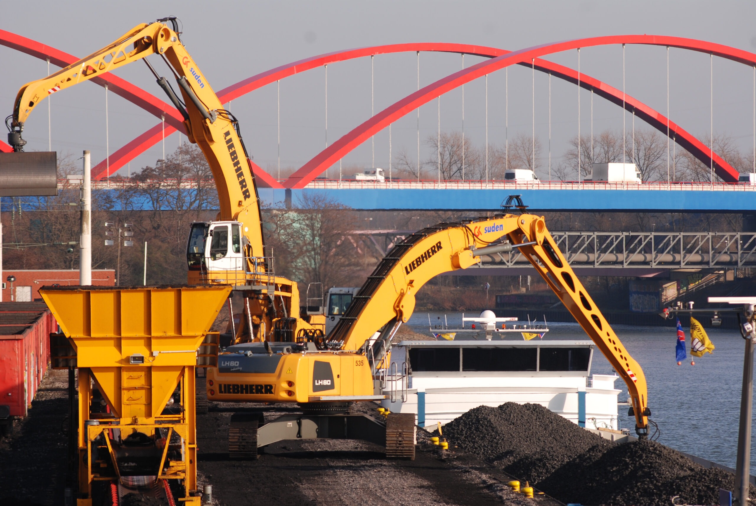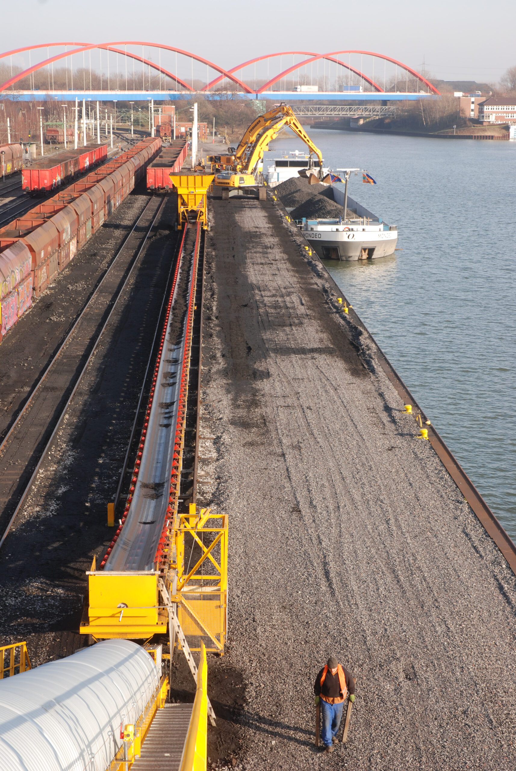 Unsere besondere Leistungsfähigkeit zeigte sich unter anderem am Stadthafen Bottrop, wo wir von 2013 bis 2022 für die Stahlindustrie täglich bis zu 6.000 Tonnen Importkohle vom Schiff auf Bandanlagen oder Züge umgeschlagen haben – und das in zwei redundanten Systemen für maximale Betriebssicherheit. Dafür setzen wir leistungsstarke Umschlagbagger, eigene Bandanlagen mit Aufgabetrichtern und Dosiereinrichtungen ein und betrieben ein Pufferlager, um jederzeit eine kontinuierliche Versorgung sicherzustellen.